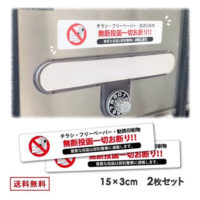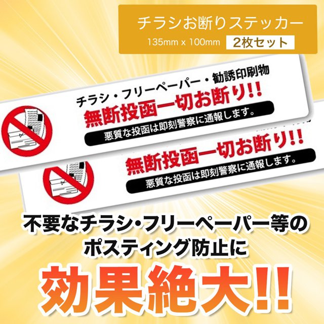 | 説明 | 郵便受けなどに貼ることによって、チラシや勧誘印刷物の投函を抑止するステッカーです。 屋外にも対応できるよう超対光インキを使用しています。 ・屋外で使用しやすいように耐久性も高い仕様となっております。 ・剥がれにくいよう角を丸くしています。 ・30mm×150mmなので郵便受けに貼りやすいサイズです。 ・「悪質な投函は即刻警察に通報します」の文言でプレッシャーを与えます。 ・集合ポストや玄関に貼っても違和感のないデザインです。 ※貼り付け面の水分・汚れ等をよく拭き取ってから貼りつけてください。 ※お使いのモニターにより、写真と実物とでは、多少、色合いが異なって見える場合がありますのでご了承下さい。 |