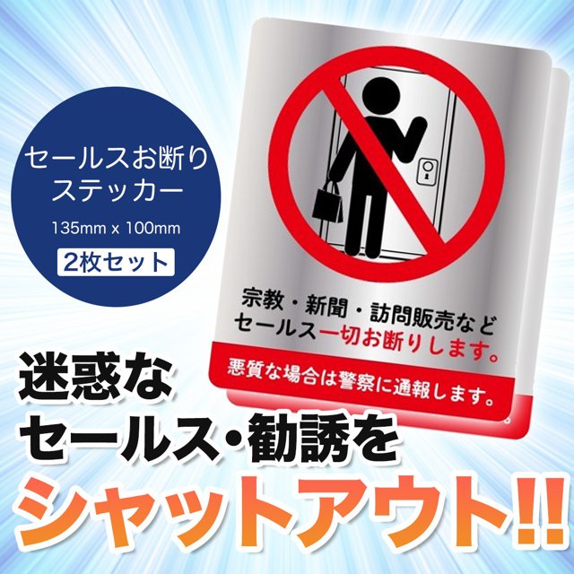 訪問販売 宗教 セールス 新聞 勧誘 お断り ステッカー 135mm x 100mm 2枚セット 目立ちやすい大型サイズ 強めの文言でセールス撃退 玄関・インターホンに