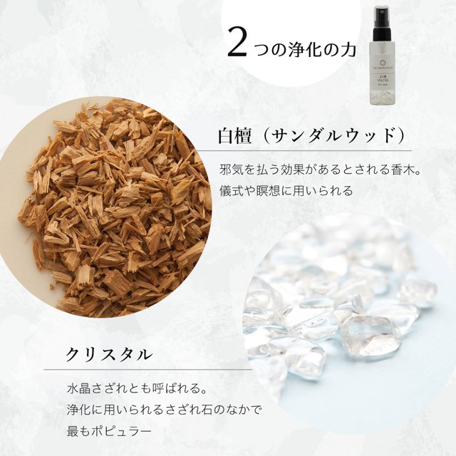 | 説明 | サンダルウッドの精油を含んだ浄化用スプレーです。 天然水晶さざれ入りです。(クリスタルの石言葉は浄化) 携帯に便利なミニボトルタイプです。 |