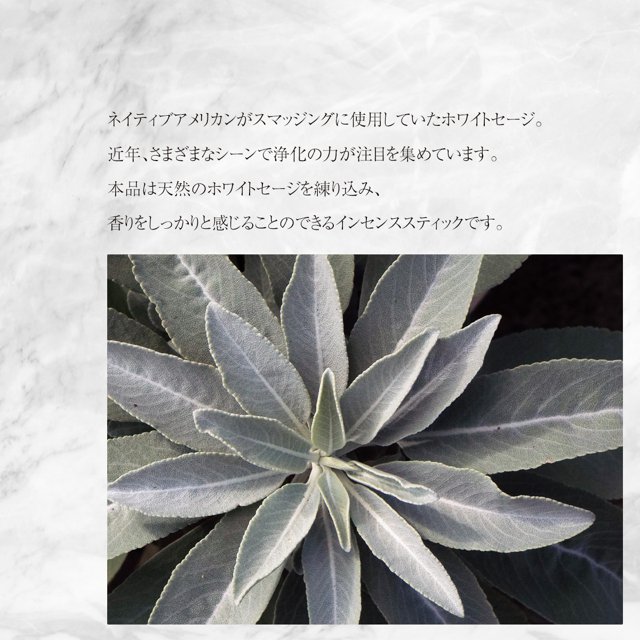 | 説明 | ホワイトセージを練り込んだインセンススティック お香を焚き、浄化にお役立てください。 天然のホワイトセージを練り込んでいるので、ホワイトセージの香りをしっかりと感じることができます。 |