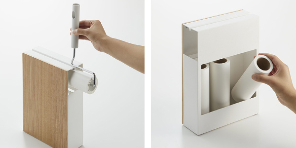 カーペットクリーナーやハンディクリーナーなどの粘着ローラーを、上品に隠して収納できるスタンドです。粘着面にほこりが付きにくい構造で、下段にはスペアテープが3本入ります。