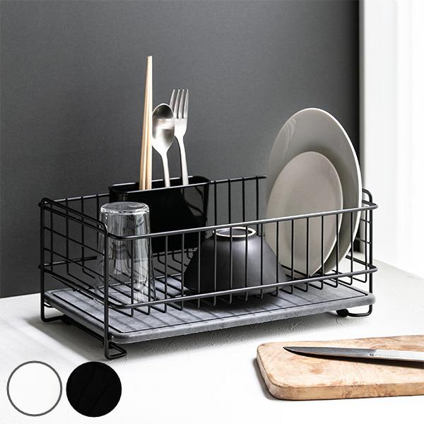 水切りかご スリム 珪藻土プレート カトラリーポケット付き スキット ( 水切りラック 水切りカゴ 珪藻土トレー ディッシュラック 珪藻土トレイ 水捨て不要 箸立て付き キッチン シンク上 珪藻土 速乾 吸水 ホワイト ブラック )