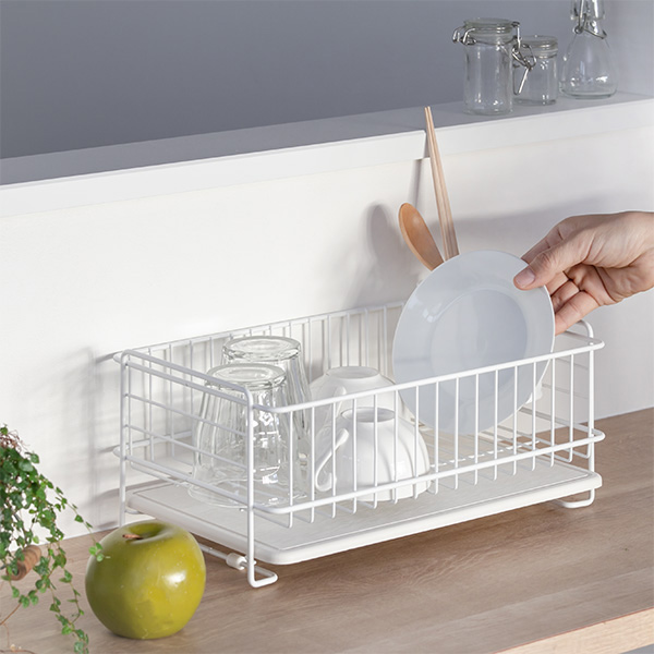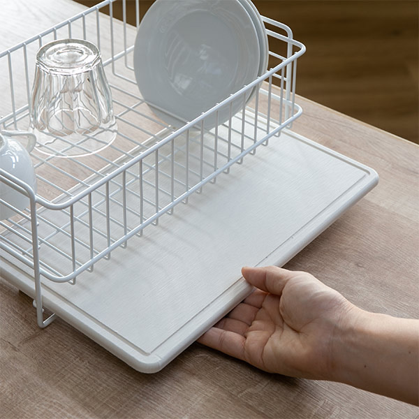 珪藻土トレーとセットになった水切りラック(スリムタイプ)です。天然素材から生まれた珪藻土トレーは洗った食器の水滴をグングン吸い込み自然に乾燥するので、水捨て不要です。水が溜まらないのでシンクに流す手間が省ける上、水垢やぬめりが付く心配もなく、お手入れラクラクです。