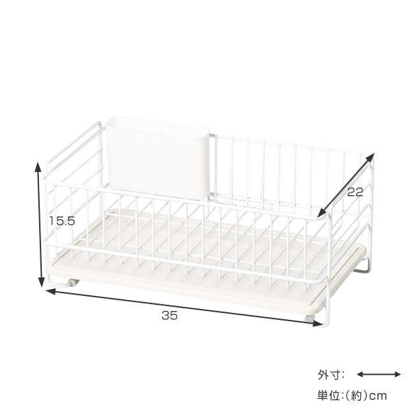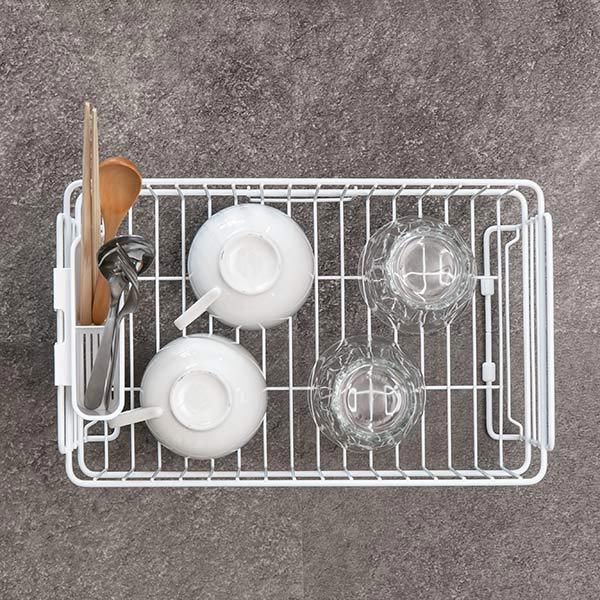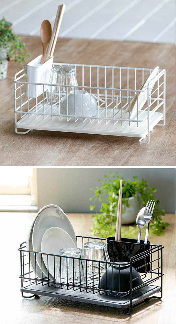 すとんとしたシンプルでかわいい角型フォルムが特徴的な水切りバスケットです。仕切りやスタンドがないシンプルなスチールフレームなのでお皿の形を選ばず、夕食で使った食器類やカトラリーまで効率的に片付けられます。また、場所を取るフライパンやお鍋なども置きやすく、使い勝手も抜群です。