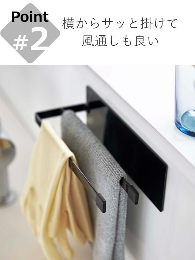 壁面に布巾を掛けることができる布巾ハンガー。横からサッと楽に掛けることが出来るタイプで風通しも良く、洗った布巾を乾かす際にも便利です。前後に2枚干すことが可能で、布巾の他にもゴム手袋なども掛けておくことができます。本体は粉体塗装された丈夫なスチール製でサビに強く、水まわりの壁面での使用も安心です。