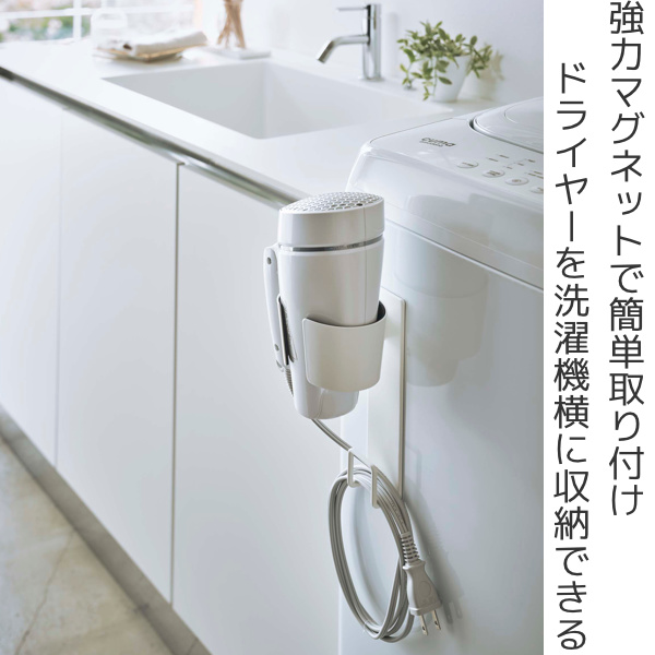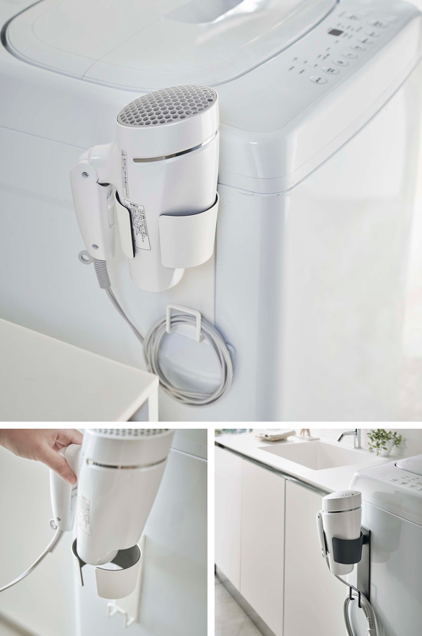 置き場所に困るドライヤーをすっきり収納できるドライヤーホルダーです。洗濯機の横に付けると、使いたいときにスッと出し入れできて快適にお使いいただけます。