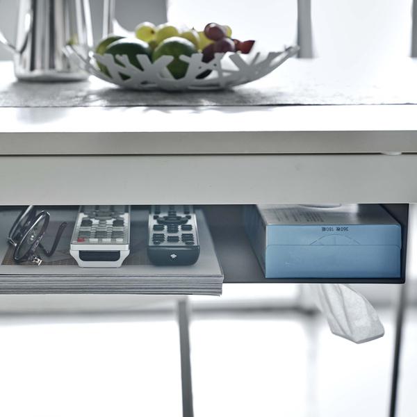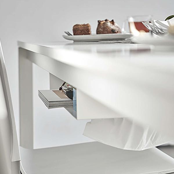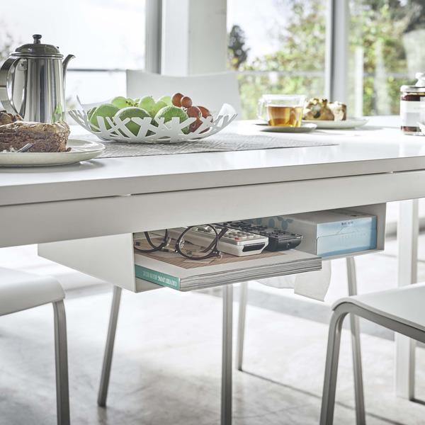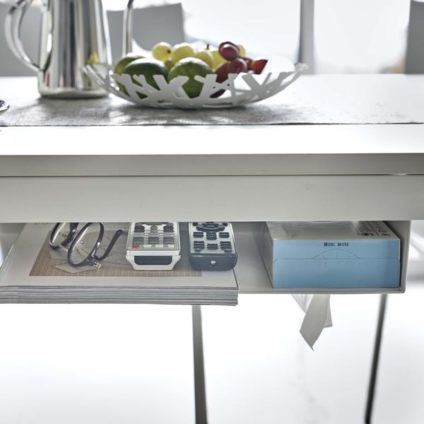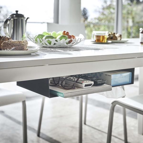 テーブル下に取り付けられて、デッドスペースを有効活用できるラックです。散らかりがちなリモコンやティッシュ等をひとまとめに出来るので、テーブル上を広々と使えてオススメです。