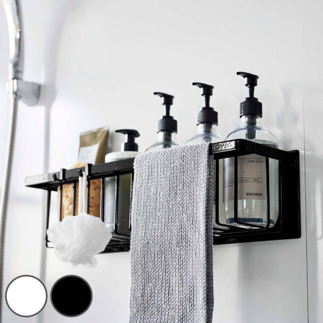 マグネットの付く壁面に簡単に取り付けできるバスケットです。ディスペンサーやチューブなどを並べて収納でき、手前のバーにはタオルなどを掛けることができます。シンプルですっきりとしたデザインは、まるで備え付けのようにバスルームに馴染みます。