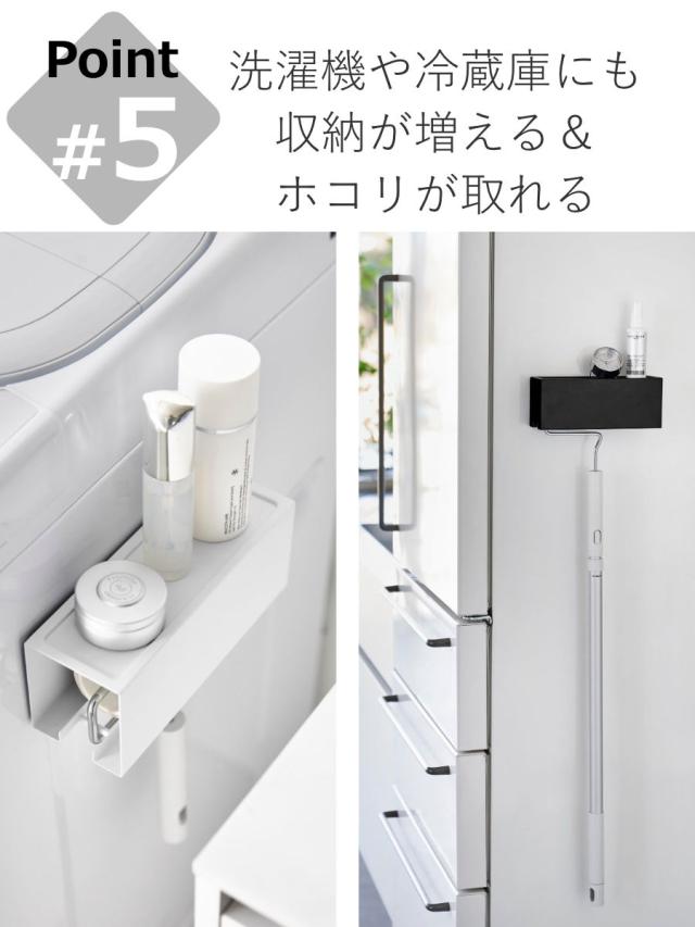 冷蔵庫や洗濯機など、マグネットが付く場所ならどこでも設置できるのが嬉しいポイントです。冷蔵庫には時計や消毒ボトル、洗濯機には整髪料や化粧品などをちょい置きできて便利です。