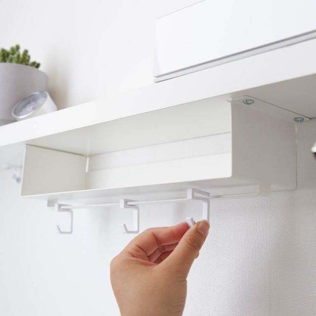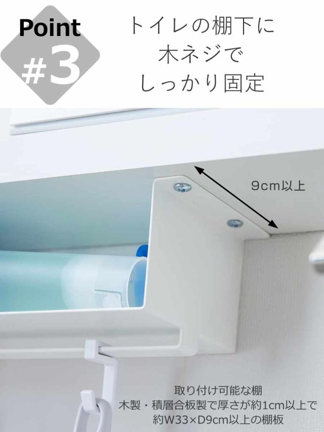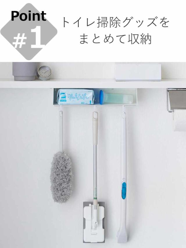 トイレの棚下に木ネジで固定するラックです。ブラシやワイパーなどの柄付きのものはフックに吊るして、お掃除シートやトイレ用スタンプなどはラックの中に収納できます。様々な形状の掃除アイテムを一括収納できるのでトイレ棚がスッキリ片付きます。