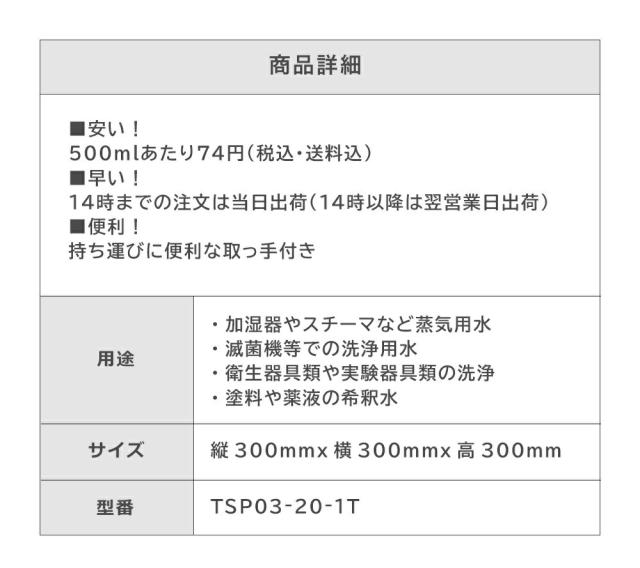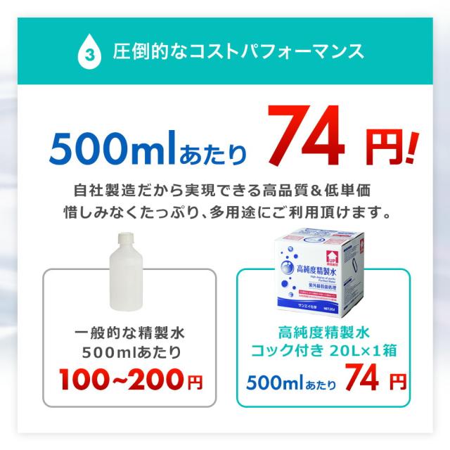 サンエイ化学 高純度精製水 20L×1箱 コック付き の特長と主な用途