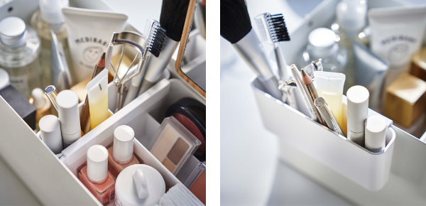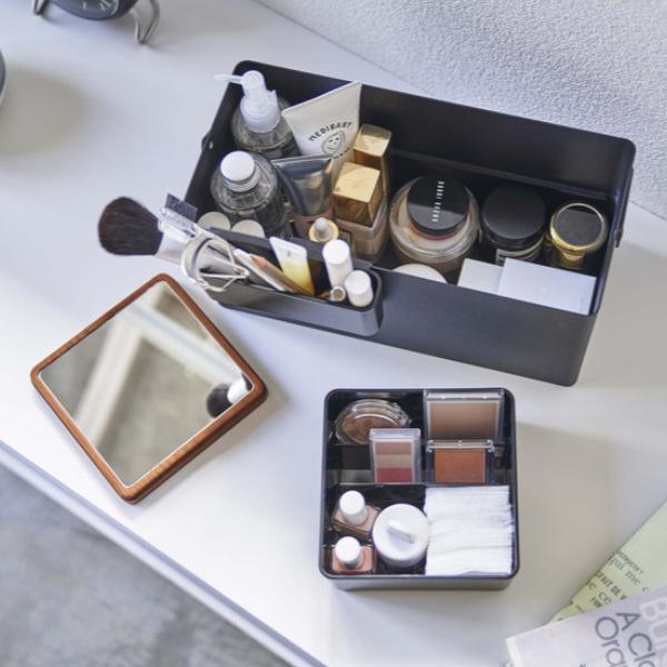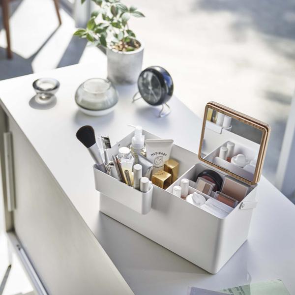 裏側がミラーになっている蓋は、ホコリ等からコスメを守ってくれて衛生的です。また、蓋が付いていない方には背の高いボトル等を入れておくことが出来ます。