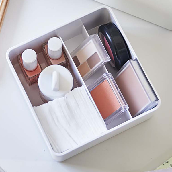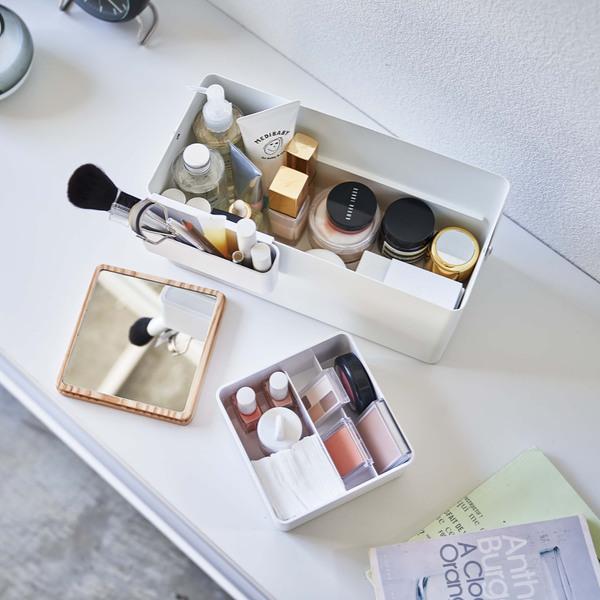 取り外せるサイズ違いのトレーが2つ付いており、収納したいものに合わせて自由に組み合わせられます。細々したメイク道具やコスメ等を整理して収納できるので使い勝手抜群です。