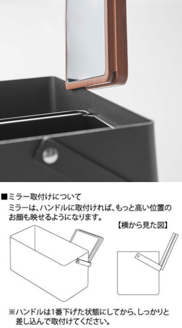 木蓋の裏側は便利なミラーになっております。本体側面やハンドル部分に差し込んでお使いいただけます。ハンドル部分に取り付ければ、より高い位置でお使いいただけて、身支度の際に便利です。