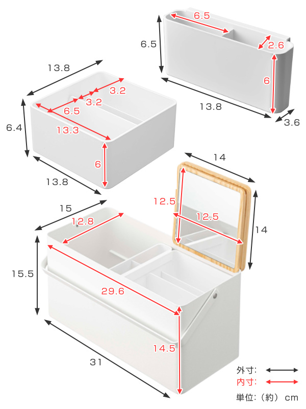 | 材質 | 容器:スチール(粉体塗装)、蓋:天然木(ラッカー塗装)、ミラー:2mm厚ガラス、トレー(大・小):ABS樹脂 |