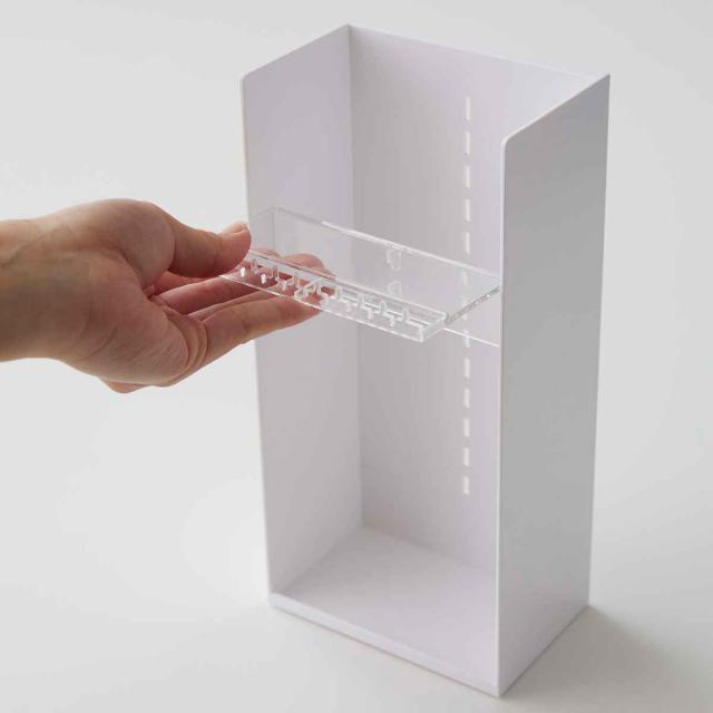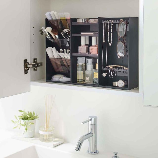 同じシリーズの収納ケースと組み合わせて使用することで、アクセサリーやメイク道具を一括収納でき、朝の身支度がスムーズになります。一般的な洗面戸棚にすっぽり入る大きさです。