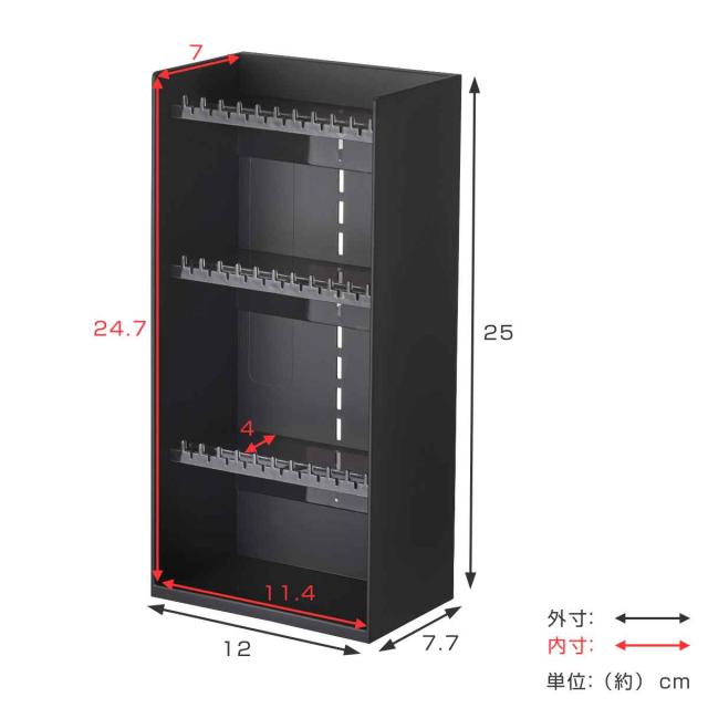 12段階の高さ調節可能なトレーが3個付属しており、ケースの奥の溝に差し込むだけで簡単に取り付けできます。トレーの高さは収納する物のサイズに合わせて約1.5cmごとに調整可能です。
