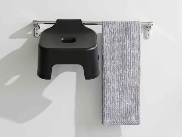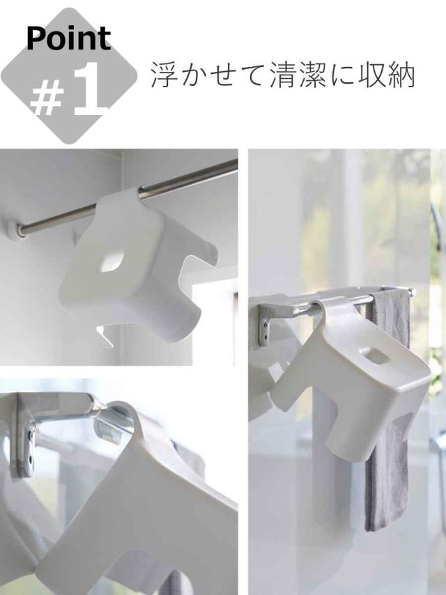浴室の物干しやタオルバー、浴室扉のハンドルなどに引っ掛けられるフックが付いているので、浮かせて収納できます。浴室の床に置かないので、清潔に収納できてお掃除もラクラクです。