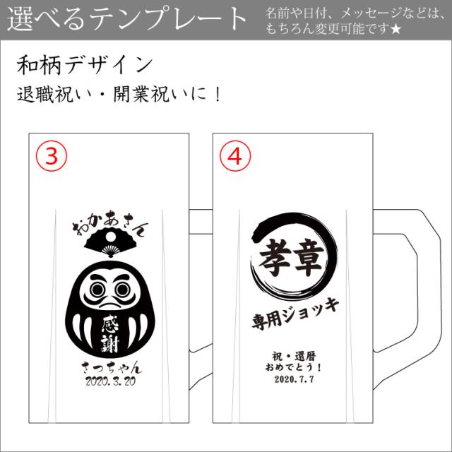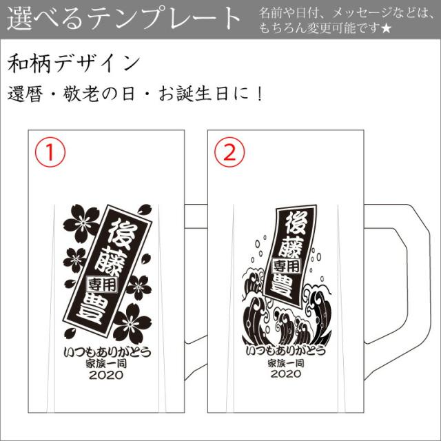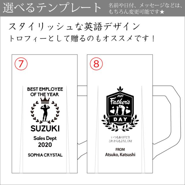 この商品は、デザインテンプレートで簡単にオリジナルビールジョッキを作ることができます。選べるテンプレートデザインは8種類! ビールジョッキにお相手の名前を彫刻することで、特別感のあるプレゼントとして人気です!