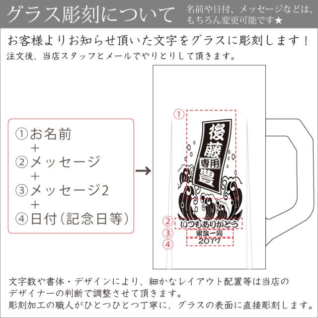 大人気の名入れギフト!ジョッキにメッセージを彫刻します。父の日、敬老の日、誕生日祝い、還暦祝い…どんなお祝いにも喜ばれるビールジョッキです。 | |