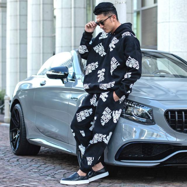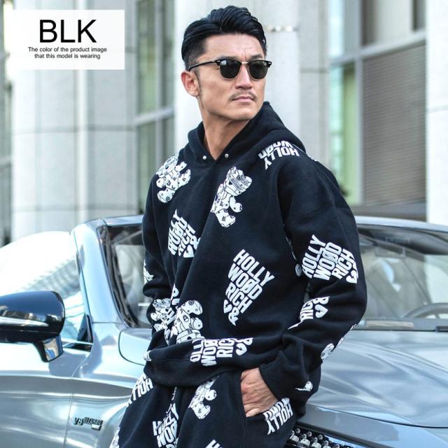 パーカー メンズ セットアップ可 ブランド おしゃれ 裏起毛 暖かい 大きいサイズ プルオーバー スウェット スエット フーディー パンク ベア クマ ロゴ 総柄 プリント ゆったり 黒 M L XL Hollywood rich.& 服 秋 冬 秋冬 メンズファッション 即日発送 [A1-7104]