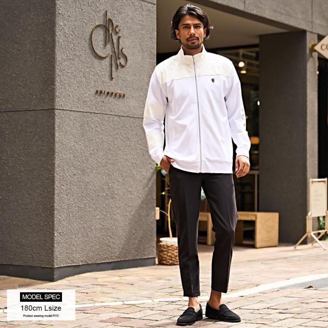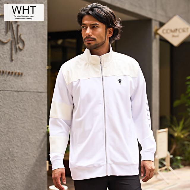 セール価格 SALE ブルゾン メンズ 上下 セットアップ可 ゴルフウェア ブランド 大きいサイズ 長袖 アウター ジャージ スタンドネック 立ち襟 ジップアップ PU 切り替え ラインストーン ロゴ 細身 スリム タイト ストレッチ 白 黒 LL XL VIOLA ヴィオラ 服 秋 冬 [Y52118]