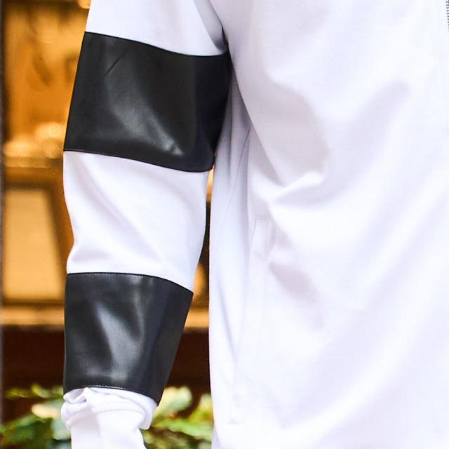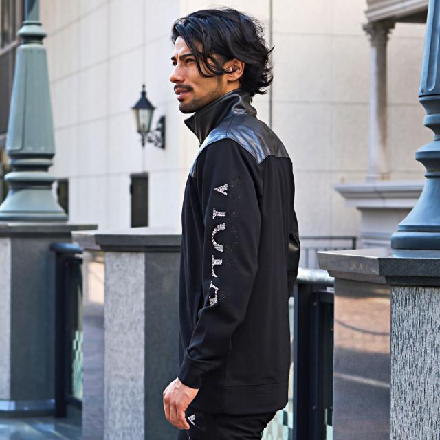 肩部分と右袖にPU切り替えを施し、左袖にはラインストーンでロゴを配置した印象的なデザイン。