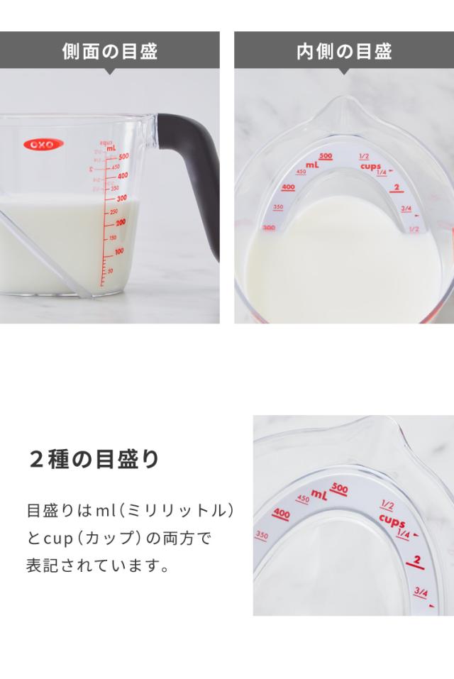 500mlサイズはスープを作る際や鍋でご飯を炊く際など分量が多めのレシピの時に、何度も計量し直す手間が省けます。