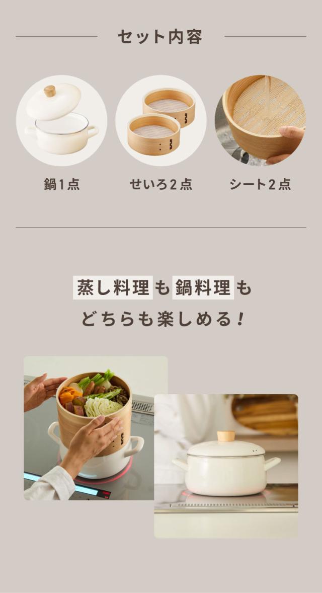 両手鍋&せいろ1段セット 20cm | 両手鍋&せいろ2段セット 20cm | 専用せいろ 追加・交換用 20cm |