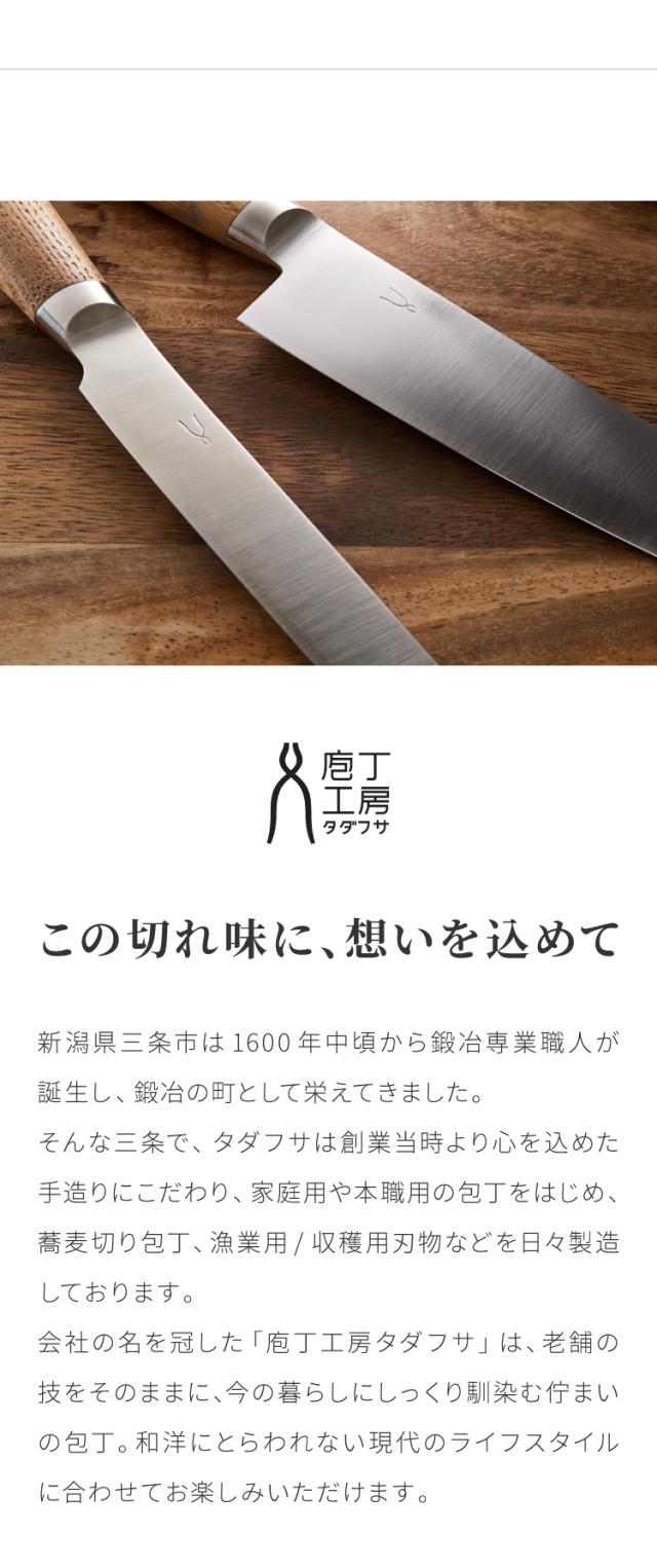 ●「庖丁工房タダフサ」の庖丁は、オールステンレスの庖丁に比べ、鋭い切れ味をお楽しみいただける分、普段の手入れに少々注意が必要となります。切れ刃には鋼(SLD鋼)を採用しているため、手入れや保管環境によって錆びが発生する場合があります。手入れや保管環境によっては、一晩でも錆びが発生することもあります。心地よい切れ味とともに、お手入れや研ぎ直しもあわせてお楽しみください。