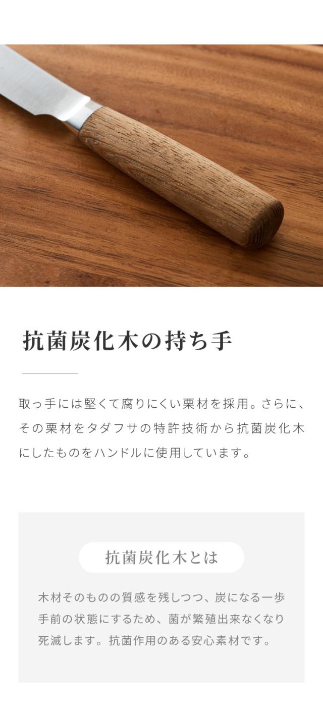 堅くて腐りにくい栗材。さらに、その栗材をタダフサの特許技術から生まれた炭化木にしたものをハンドルに使用しています。木材そのものの質感を残した炭化木は、炭の一歩手前の状態にして菌が繁殖出来なくなり死滅してしまう木材です。