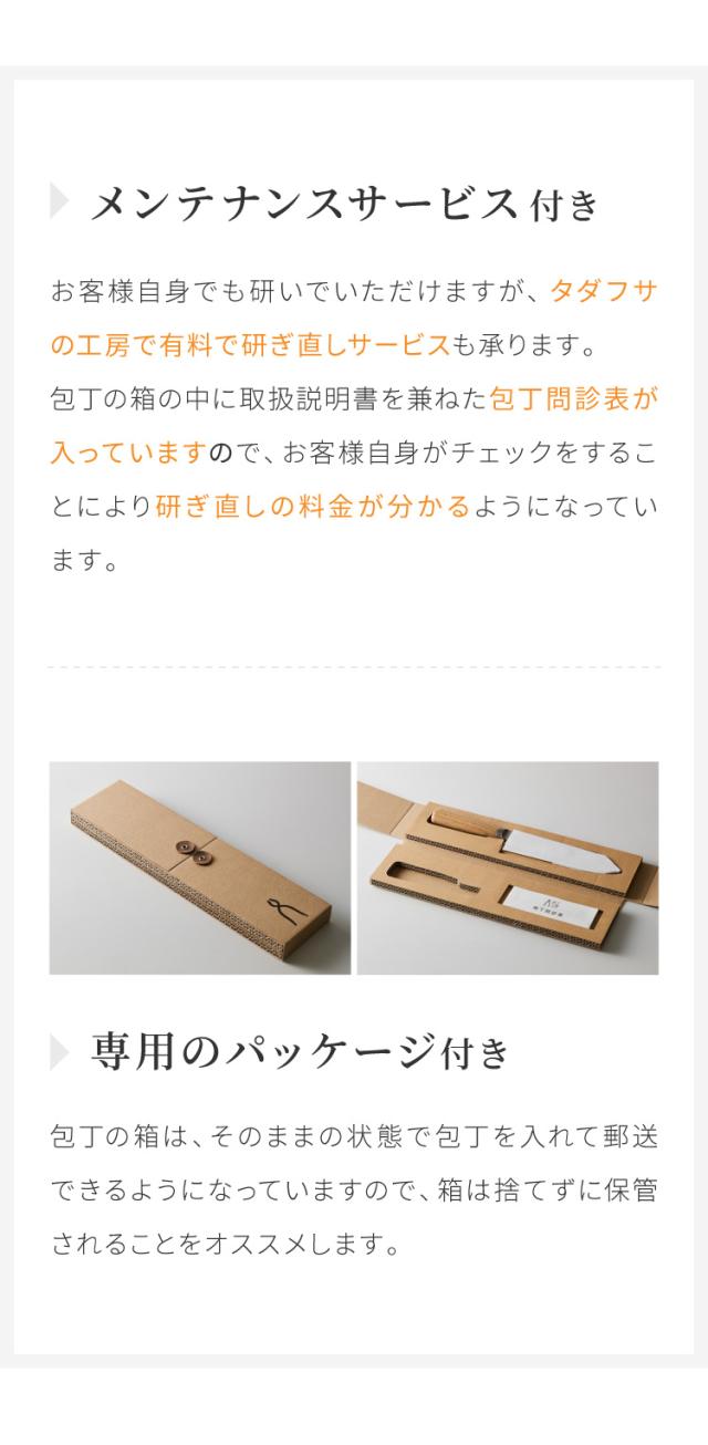お客様自身でも研いでいただけますが、タダフサの工房で有料で研ぎ直しのサービスも承ります。庖丁の箱の中に取扱説明書を兼ねた「庖丁問診表」が入っていますので、お客様自身がチェックをする事により研ぎ直しの料金が分かるようになっています。