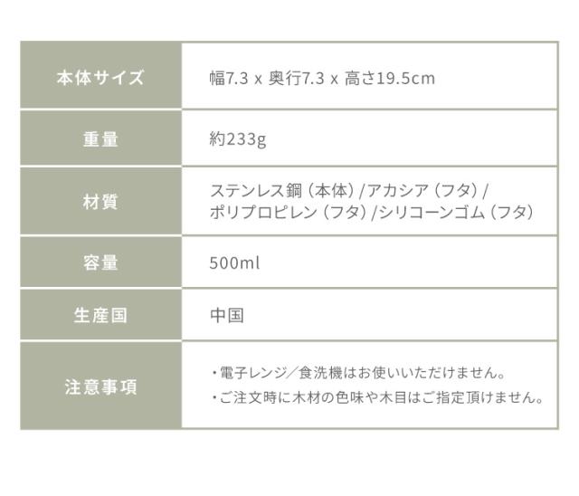 ステンレス鋼(本体)/アカシア(フタ) /ポリプロピレン(フタ)/シリコーンゴム(フタ)