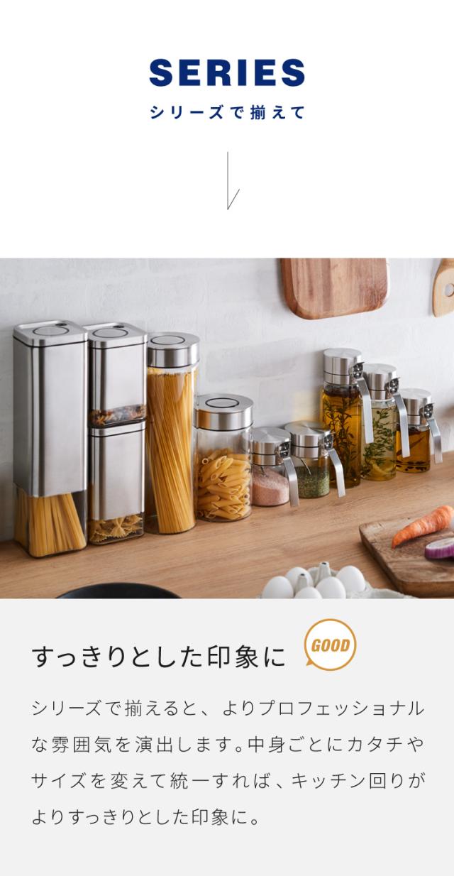 ステンレスとガラスで清潔感のあるデザインなので、一式揃えて並べるとどこかプロフェッショナルなキッチンに。