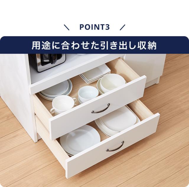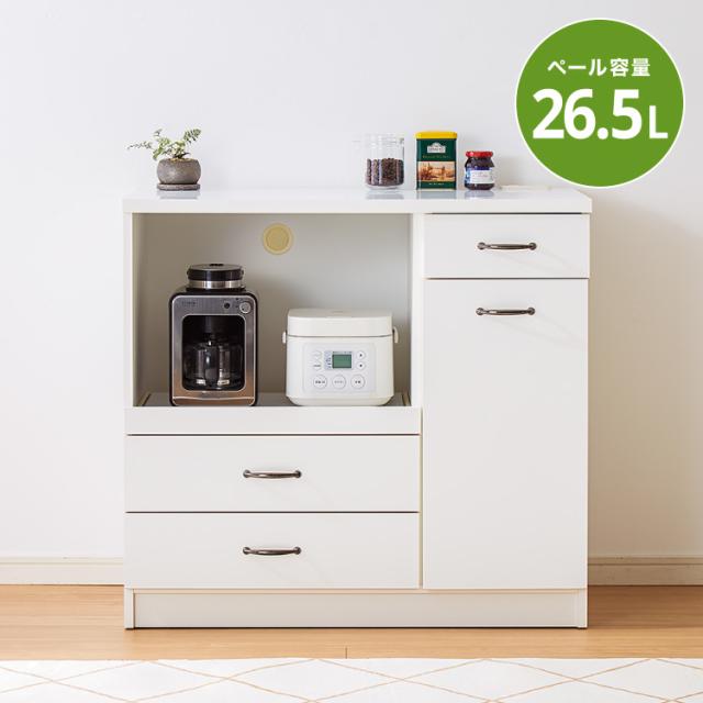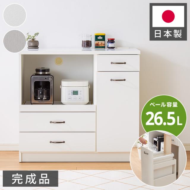 日本製 キッチンカウンター 90 完成品 スライドレール ゴミ箱付き 引き出し収納×3 間仕切り 幅88.5×奥行44.5×高さ82cm フルオープン(代引不可)