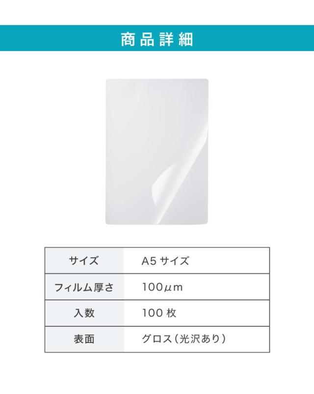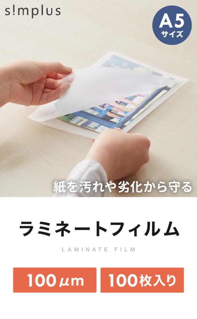 simplus ラミネートフィルム A5サイズ 100枚入り 100μm ラミネーター専用フィルム 印刷物保護 パンフレット 名刺 写真 透明度 グロス 耐水性 3層構造 長持ち 反りを防ぐ シンプラス SP-LMN-A5