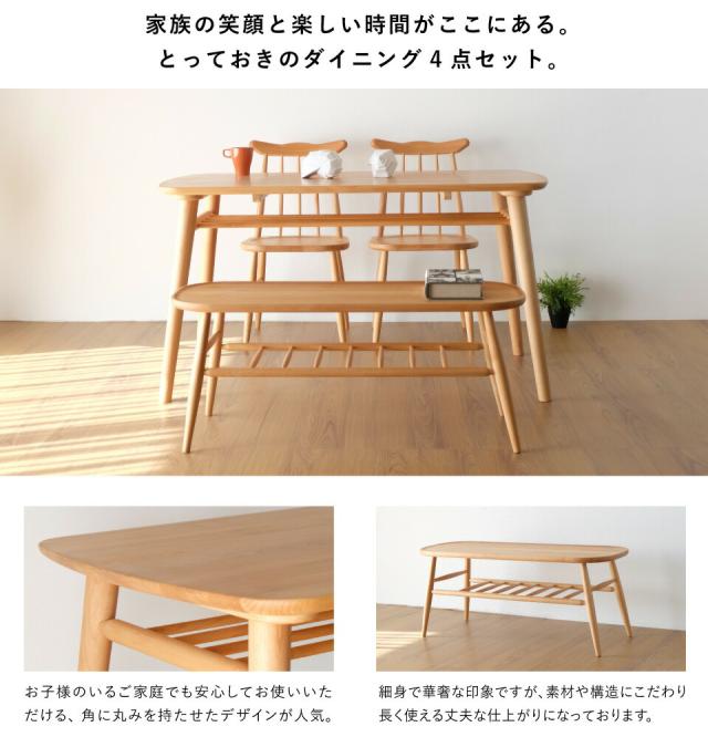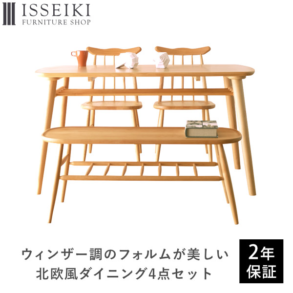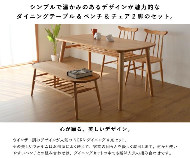 【12/23限定!ポイント10倍!】 ダイニングテーブルセット ダイニングセット テーブルセット 4点 4人掛け テーブル チェア ベンチ 背もたれ無し 棚 ラック 木製 天然木 ウィンザー調 レトロ 北欧 カフェ 店舗 什器 品質保証 NORN ISSEIKI