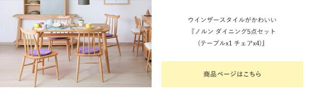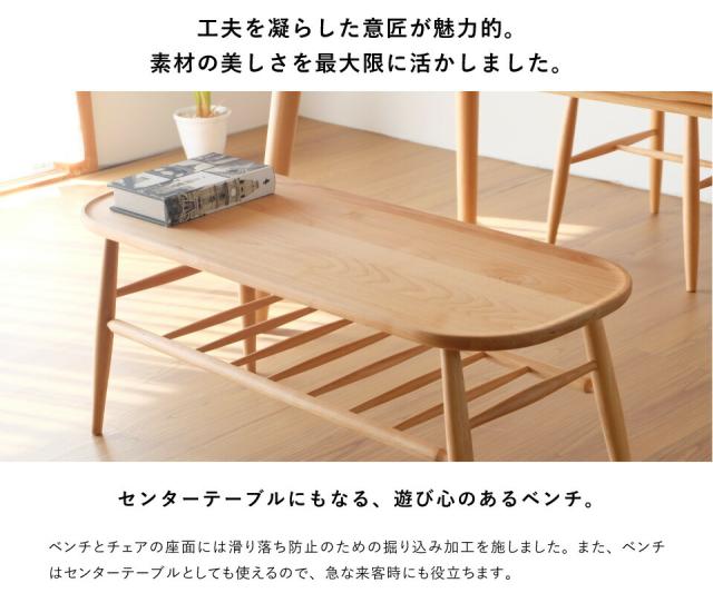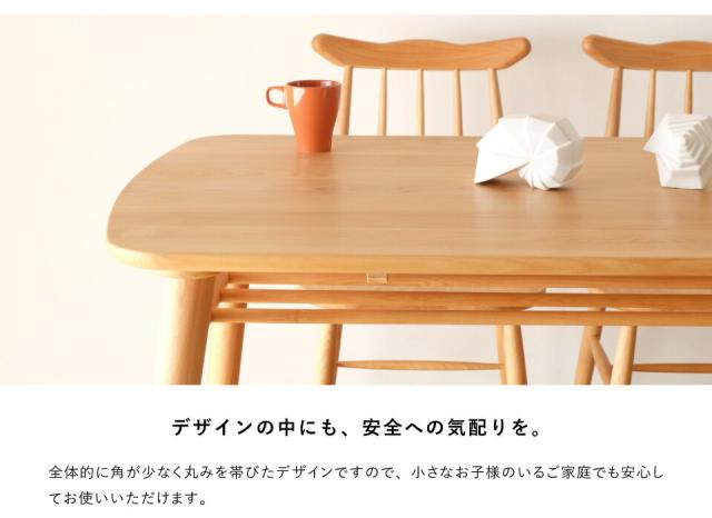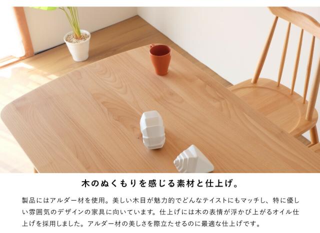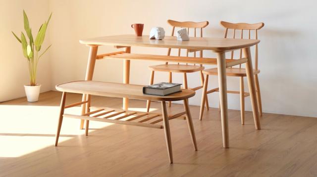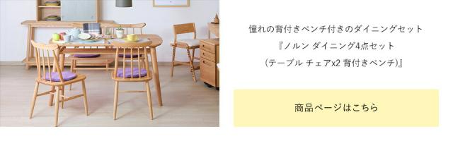 北欧デザインをベースとしたウインザー調のフォルムが美しい『ノルン』。その繊細で美しくしなやかな佇まいはリビングやダイニングにおいて存分に存在感を発揮します。アルダー材を贅沢に使用し、触り心地・なめらかな質感には絶対の自信をもっております。そのアルダー材の素材感を存分に活かすために仕上げには自然系オイルを。紅花油や亜麻仁油をベースとした安心安全なオイルを木材の表面から内部に浸透させて木の表情をしっとりとうかびあがらせることのできる仕上げです。デザインも美しいだけではなく機能性も十分に考慮して作られております。全体的に角には丸みを持たせているので小さなお子様のいるご家庭でも安心してお使いいただけます。ダイニングチェアとベンチには滑り落ち防止のための掘り込み加工を施し、座りやすく設計しているので体にフィットして座りやすくなっております。また、ベンチをセンターテーブルとして使用する際にも天板に置いたものが転がり落ちることが少なくなります。家族の笑顔が集まる場所としての役割を十分に果たす美しいダイニング4点セットです。