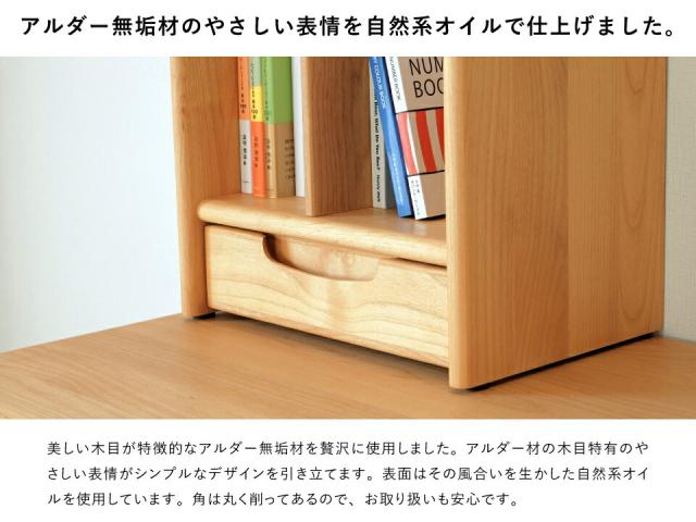 アルダー無垢材を贅沢に使用した北欧ナチュラルテイストの『エリスキッズ』のブックスタンド。角に丸みを持たせた優しい雰囲気が人気です。シンプルなデザインがアルダー無垢材の持つ美しい木目を際立たせ素材の魅力を存分に発揮させます。仕上げにはお子様にも優しい自然系オイルを採用しました。コンパクトなサイズでデスクに置いても邪魔になりにくく、散らかりがちなデスクスペースの整理整頓に役立ちます。教科書やノートなどの整理に便利なブックスタンドは仕切り板が可動式なので、お好みの場所に合わせて自分好みに。引き出しスペースには細々した文房具などを収納すればスッキリします。大人も使えるシンプルデザインなのでいつまでも末永くご使用いただくことができます。