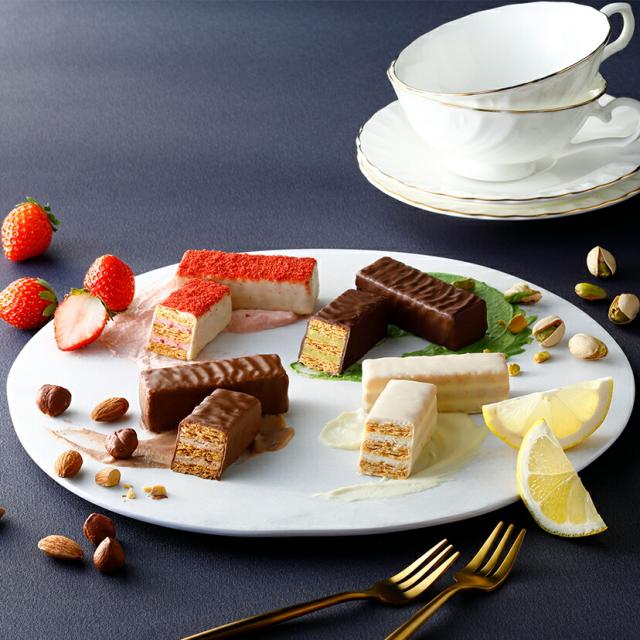 甘みと酸味のバランスが絶妙ないちごクリームを使用した「いちご」、爽やかな香りと酸味の広がるレモンクリームを使用した「れもん」、濃厚で奥深い味わいのピスタチオクリームを使用した「ピスタチオ」、香り高く風味豊かなアーモンドとヘーゼルナッツを使用した「ジャンドゥーヤ」と個性の異なる4つのミルフィユを詰合わせました。大切な方への贈り物や、手土産にもおすすめです。