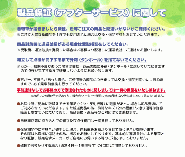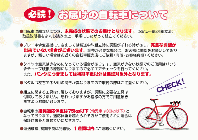 自転車をご検討の際は必ずご確認を頂き、ご了承を頂きました上でご注文をお願い致します。