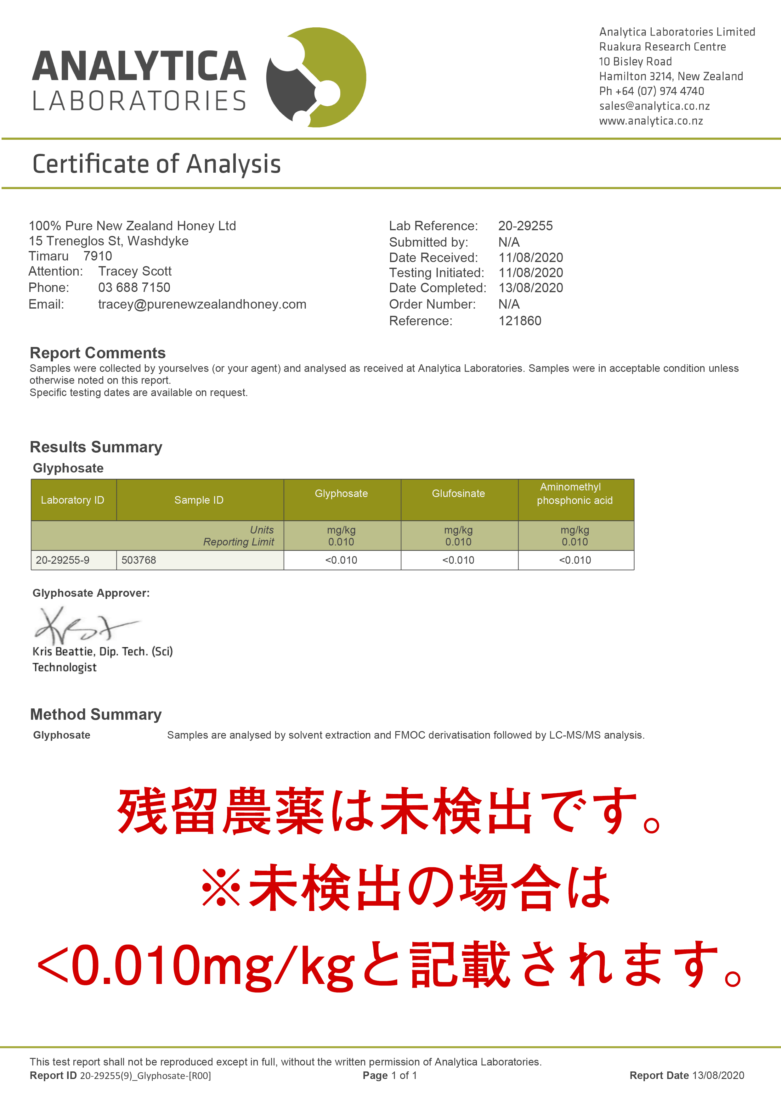 その結果、当店取扱マヌカハニーから「除草剤グリホサート」の検出がされたことはありませんので、どうぞ、ご安心をして頂ければと存じます。 | |