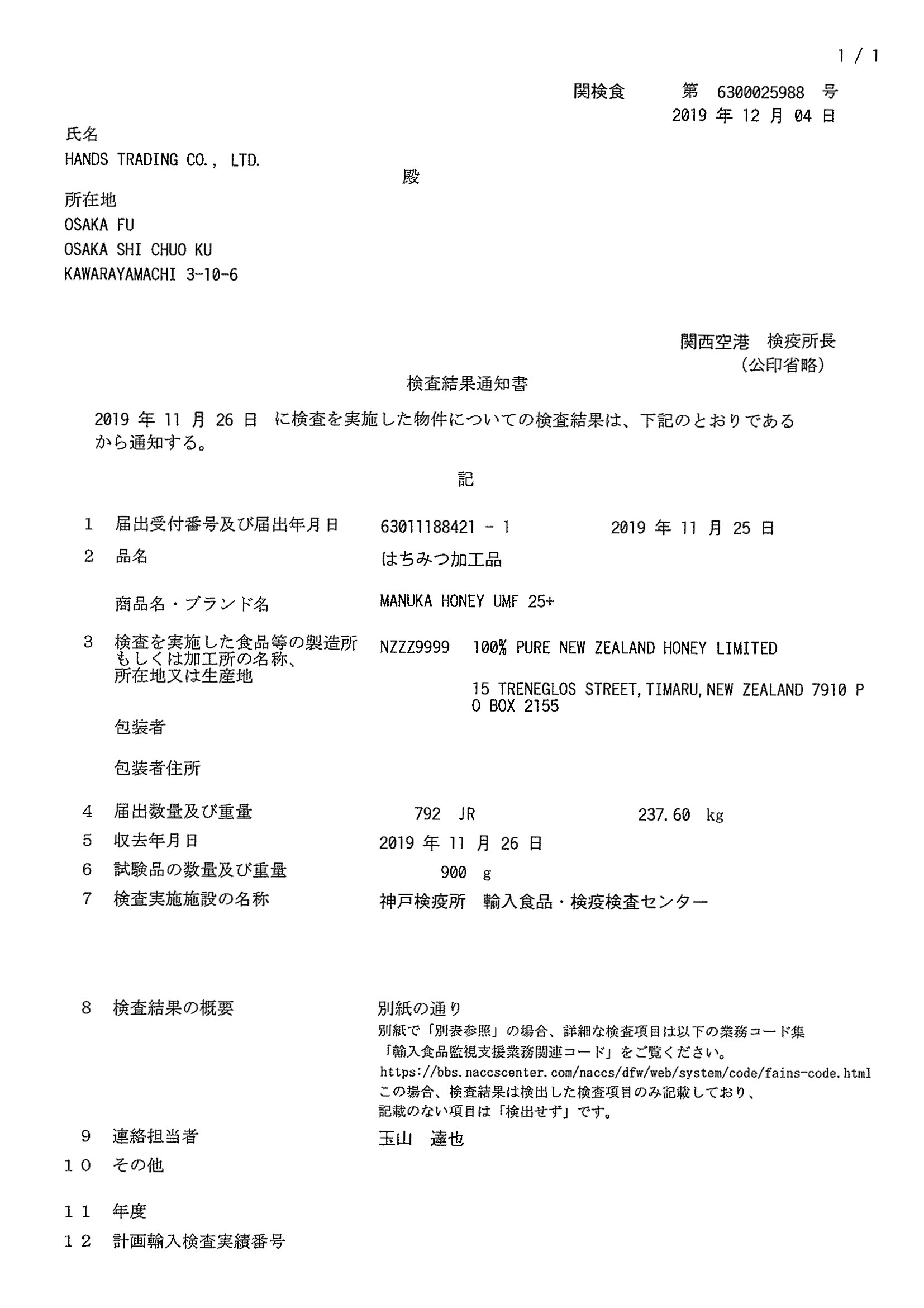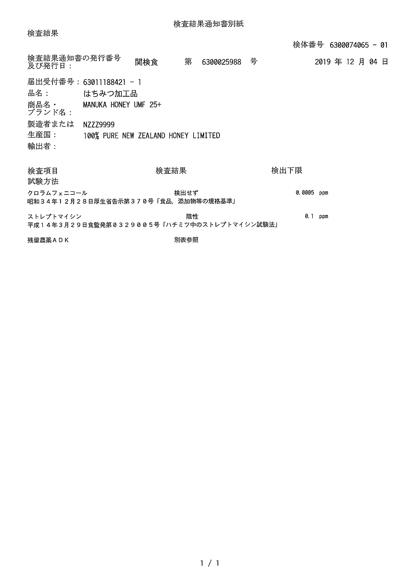 | 当店も、引き続き輸入時の定期的な農薬検査や、メーカーと随時確認及び連携を取って参ります。 今回多数問い合わせ頂いておりますので、原料時点でのグリホサート残留検査だった部分、ロット毎の残留検査報告書を添付してもらうことになりました。 マヌカハニーは信頼の置けるメーカー(UMFやMGOの取得等)から購入することを大変おすすめいたします。 今後とも、当店取扱マヌカハニーを何卒よろしくお願い申し上げます。 | |