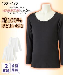 キッズ ウォームコアコットン あったか 綿100% 吸湿発熱 長袖 インナー 2枚組 男の子 女の子 子供服 ジュニア服 冬 黒2枚組/白2枚組 身
