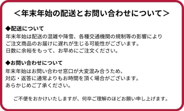 年末年始は配送混雑や降雪等によりお届けが遅れる場合があります。予めご了承ください。