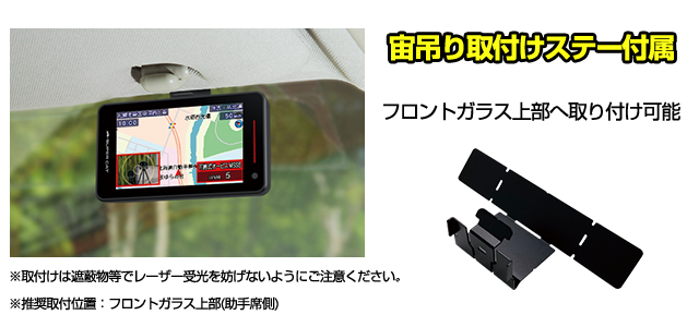 また、「YPK-21T」「YK-3000T」「YK-2000T」「YK-100T」「LS1200L」「LS1100L」「LS350L」といった宙吊り取付けステーが付属しているモデルは、フロントガラス上部への取り付けが可能です。
